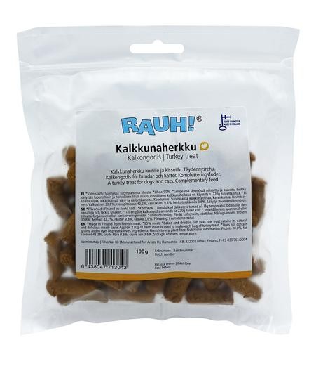 RAUH har all tillverkning i Finland och råvaran är finsk och noga utvald. Kalkonköttet bakas långsamt i ugn på låg temperatur så den naturliga smaken bibehålls. Ett gott och nyttigt belöningsgodis på promenaden likväl som till träningen. Köttinnehållet är 90%.
